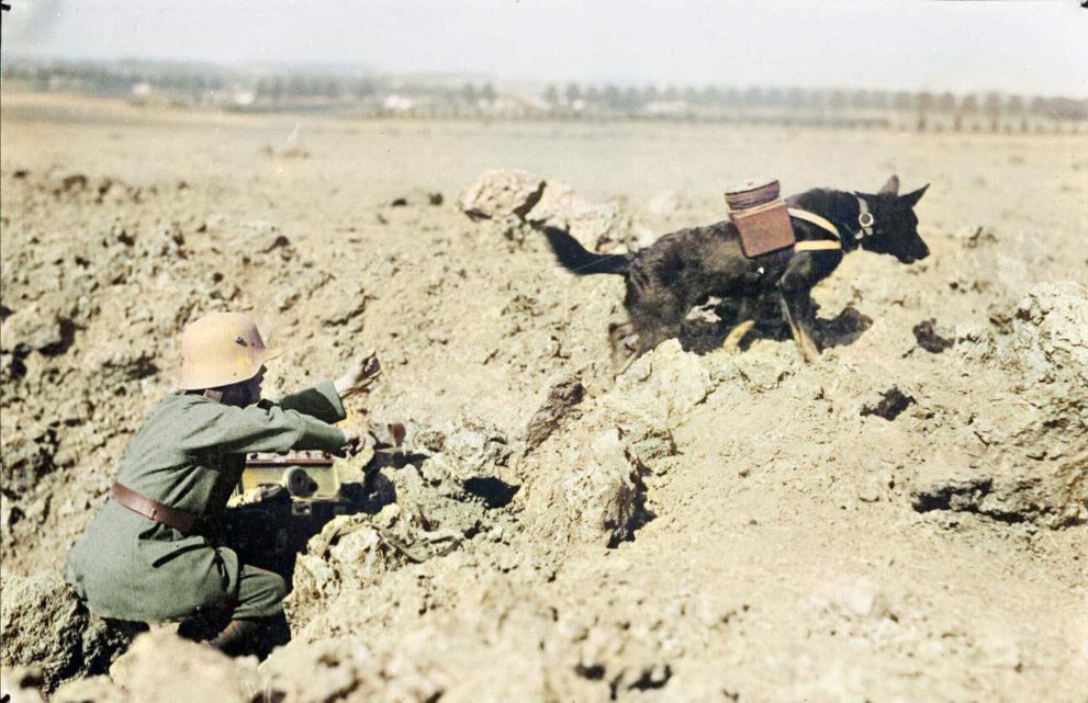 - Les chiens : Polyvalents et loyaux, ils étaient utilisés comme sentinelles, estafettes pour transmettre des messages vitaux sous le feu, détecteurs de mines, ou encore chiens sanitaires pour retrouver les blessés dans le no man's land.
